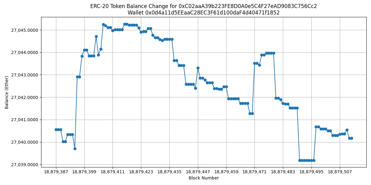 matplotlib. The x-axis represents block numbers, and the y-axis represents the balance in Ether. - The axis tick labels are formatted for better readability, and the chart is titled with the contract and wallet address for reference.