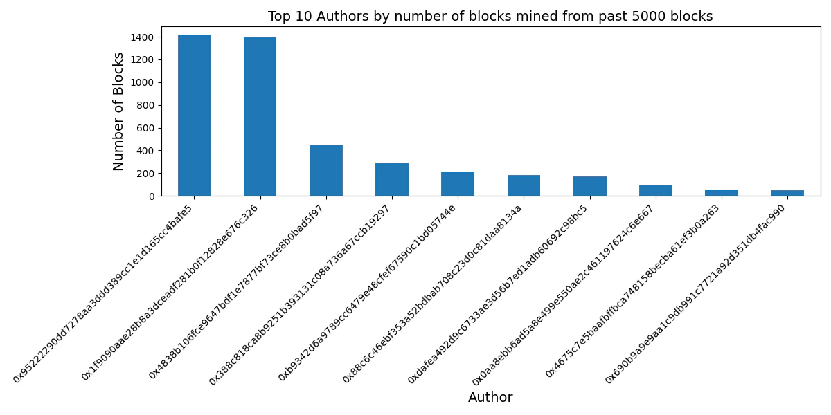 mainfunction, we initialize a Web3 instance, connect to the Ethereum node, fetch the block data, and, if successful, visualize the top authors. We handle potential errors, such as missing environment variables or connection issues, to ensure robustness. - Running the Code: This script is designed as a standalone program. When executed, it will display a bar chart illustrating the most active Ethereum block authors over a specified block range.